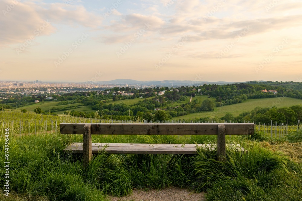 Fototapeta Wooden bench overlooking a grassy field with a picturesque view of Vienna in the