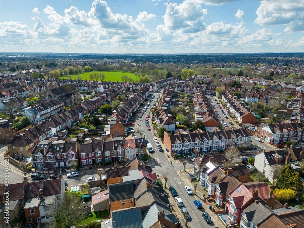 Fototapeta Scenic view of a small town, featuring a landscape of houses, buildings and tree