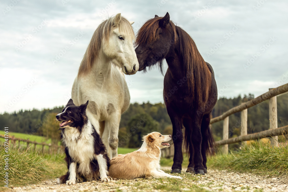 Fototapeta Two border collie dogs sitting in front of two icelandic horses in autumn outdoo