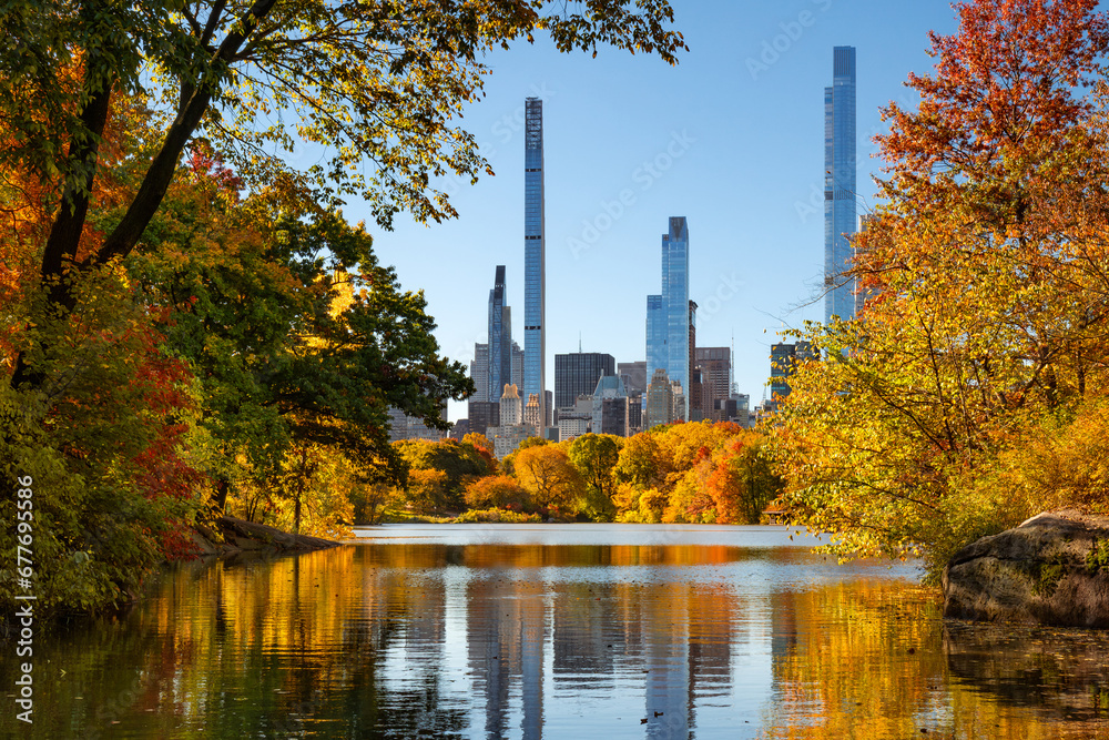 Fototapeta Central Park in autumn by the Lake with view of Billionaires' Row skyscrapers