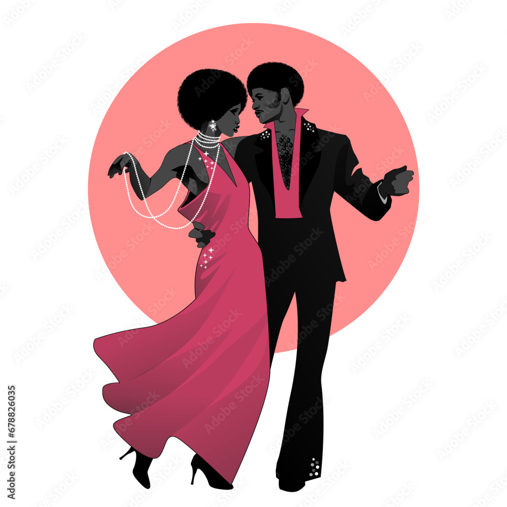 Fototapeta Elegant couple dancing funk, soul or disco music, retro style, isolated on white background