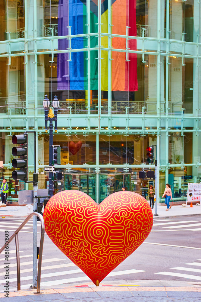 Fototapeta Red love heart art with yellow lines and pride flag in glass building front near