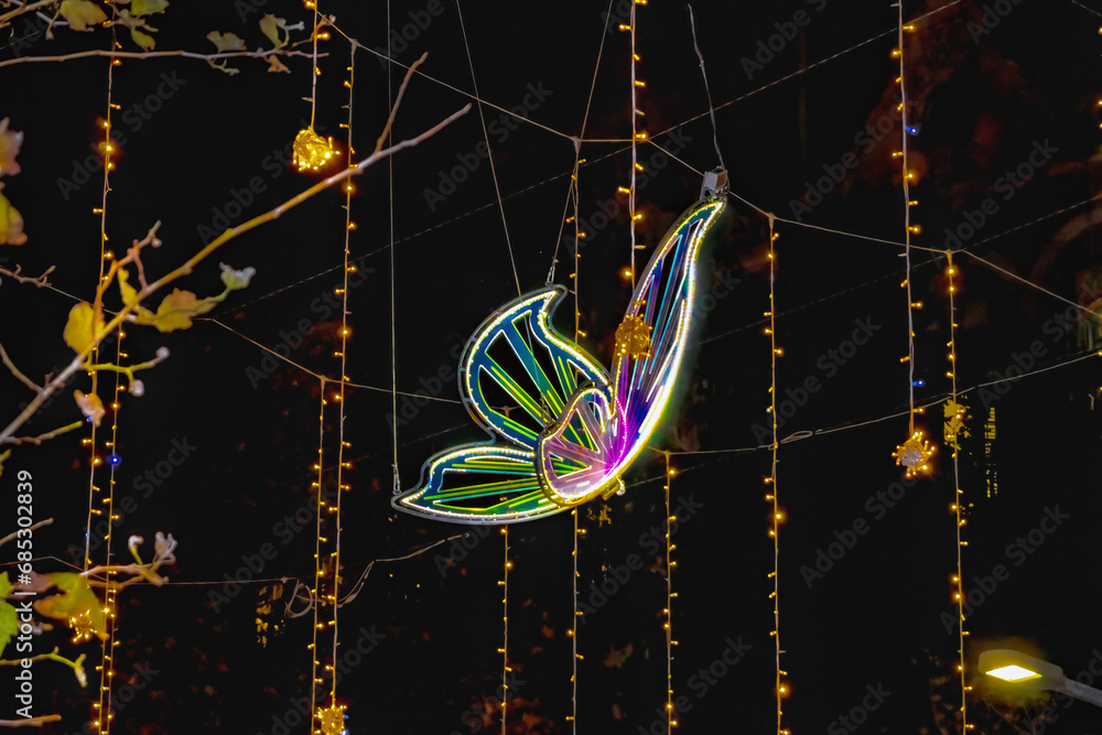 Fototapeta Neon butterfly among Christmas garlands against the background of the black sky at dusk, close-up