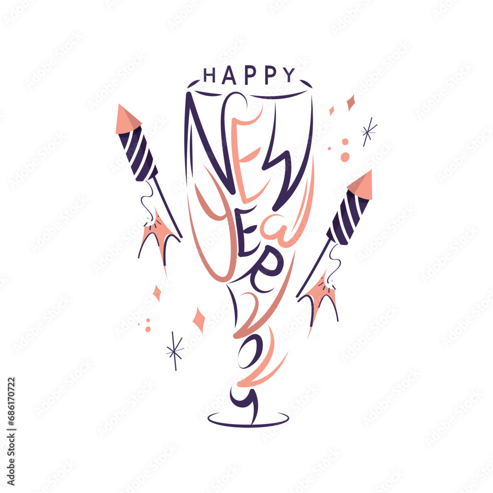 Fototapeta Creative Wine Glass or Cocktail Made By Happy New Year 2024 and Fireworks Rockets on White Background