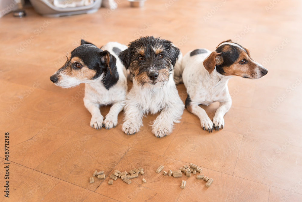 Fototapeta Three obedient dogs make room in anticipation of food - Jack Russell Terrier