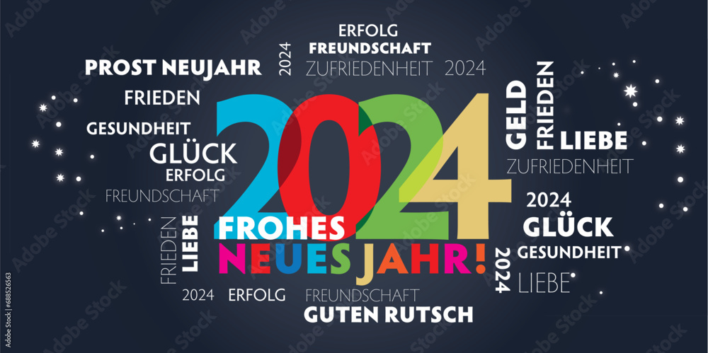 Fototapeta Neujahrsgruß 2024 - bunter fröhlicher Text mit verschiedenen Grußformeln und Wün