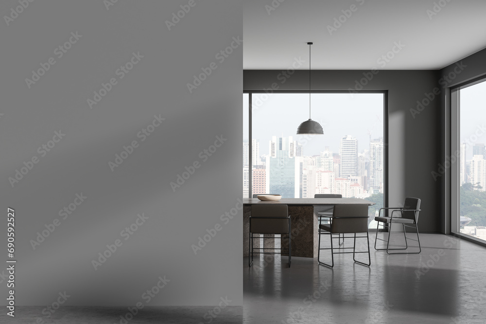 Fototapeta Grey living room interior with eating table and chairs, window