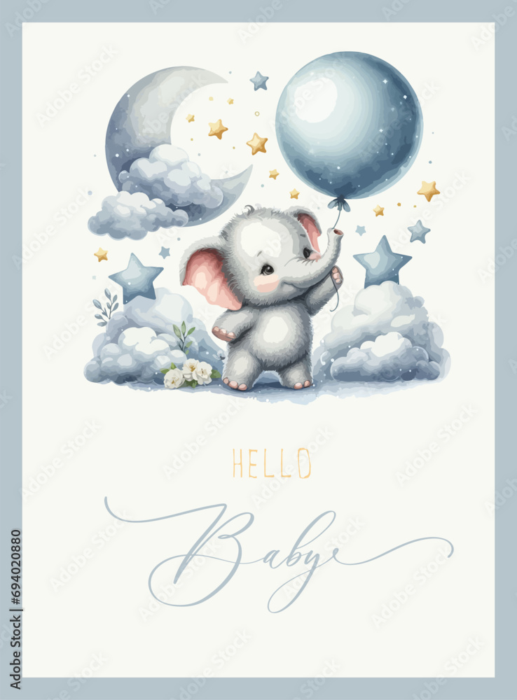 Fototapeta Cute baby shower watercolor invitation card with elephant on cloud