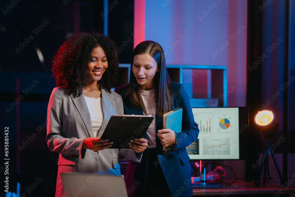 Fototapeta African American worker with an afro and a Caucasian worker discussing a clipboard in a vibrant office setting, possibly during overtime