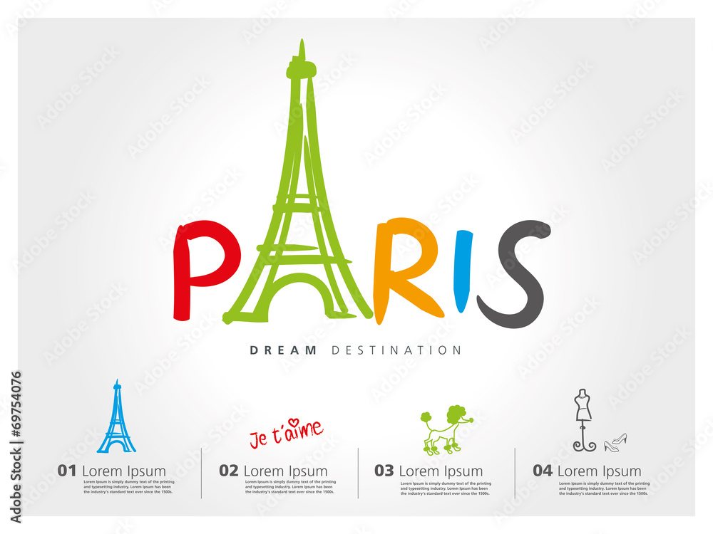 Fototapeta Paris travel set, France, Eiffel tower, typography