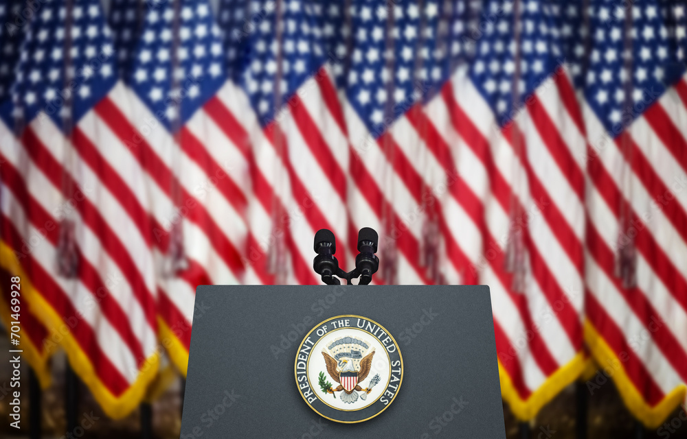 Fototapeta Empty Tribune for Speeches American President Against the American Flags Background
