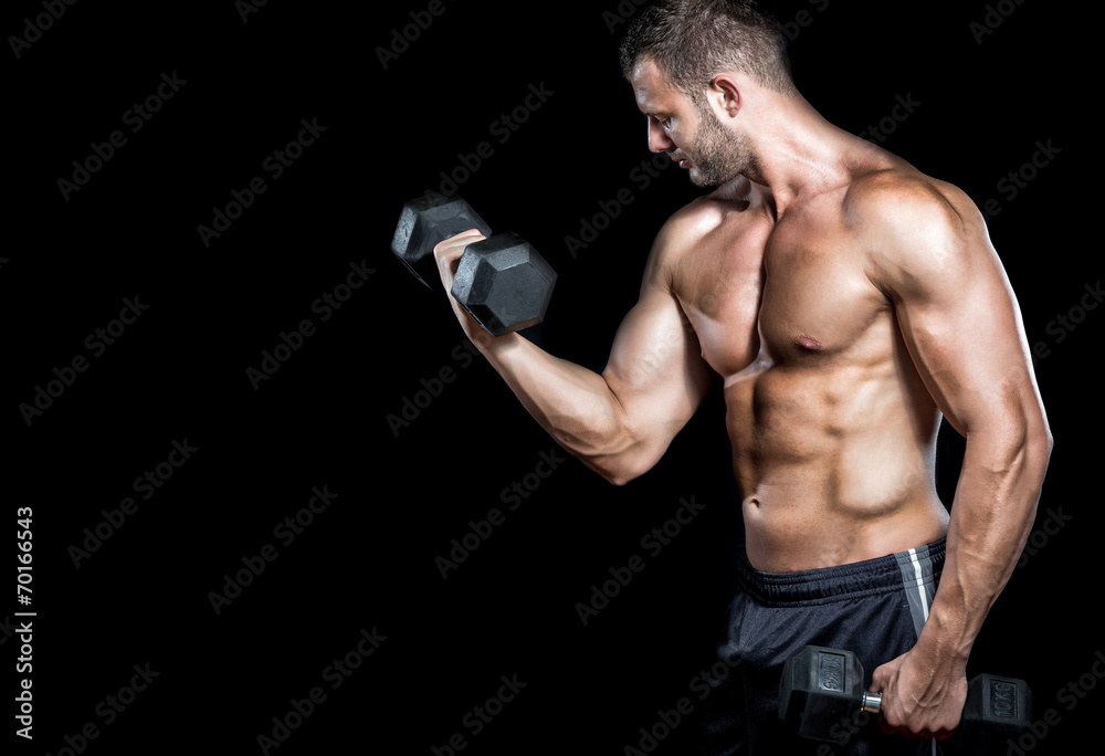 Fototapeta Man doing biceps curls in gym.