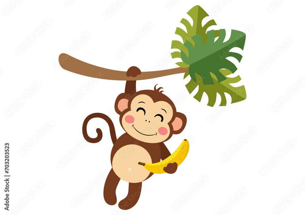 Fototapeta Happy monkey hanging from palm branch holding a banana