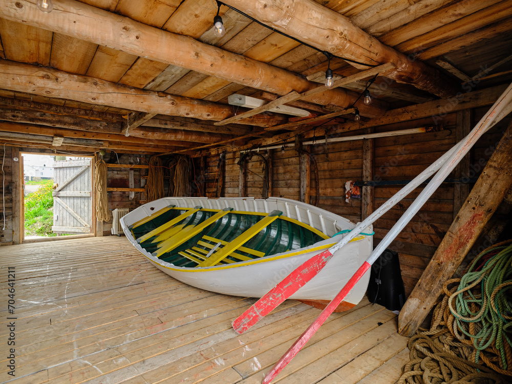 Fototapeta A Punt Style rowboat inside a boathouse on Joe Batt's arm on Fogo Island Newfoun