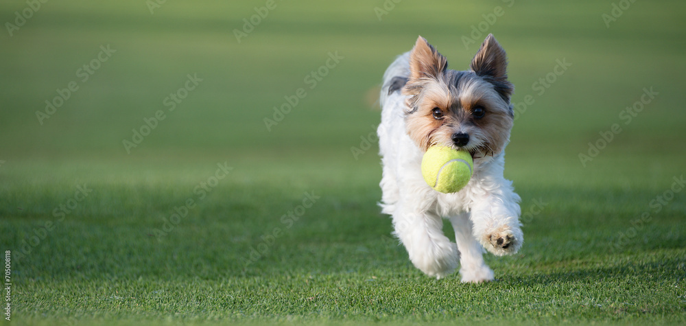 Fototapeta Happy Biewer Yorkshire Terrier dog running in the grass with ball toy for dogs outdoors on a sunny day