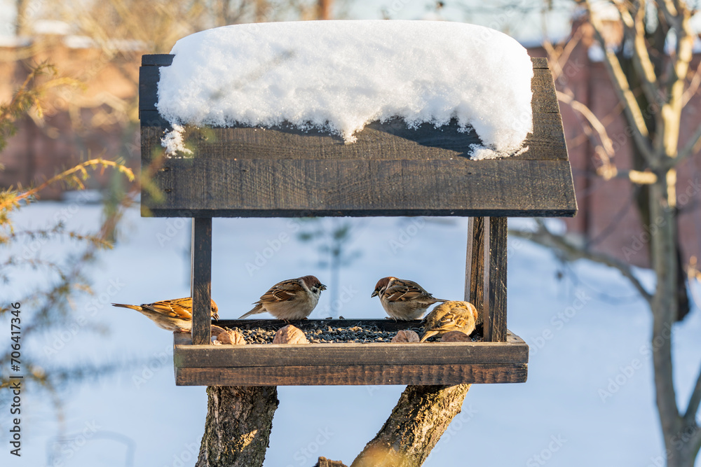 Fototapeta Wooden bird feeder on winter garden. Sparrows in feeder, close up