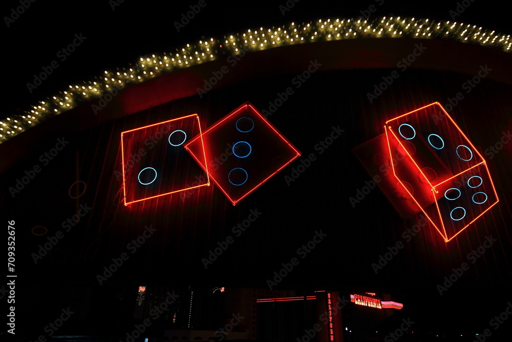 Fototapeta Colorful neon advertises gambling opportunities in Las Vegas with dice rolling across a sign