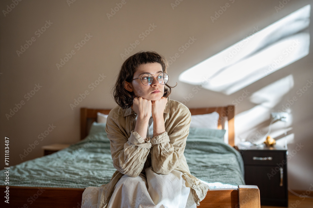 Fototapeta Depressed lonely woman sitting on cozy bed sadly look at window feeling anxiety
