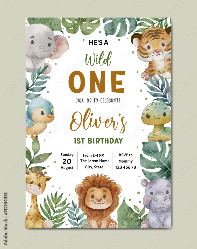 Fototapeta Birthday invitation safari theme watercolor template background