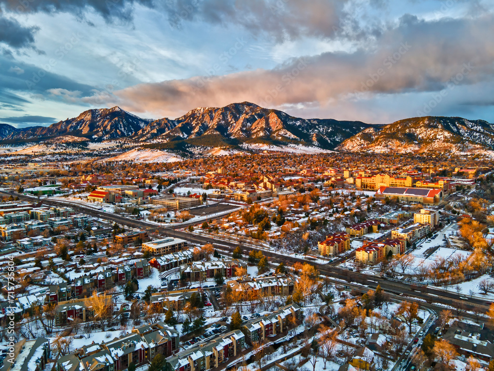 Fototapeta Drone view of University of Colorado, Boulder and the Flatirons at sunrise in the winter snow