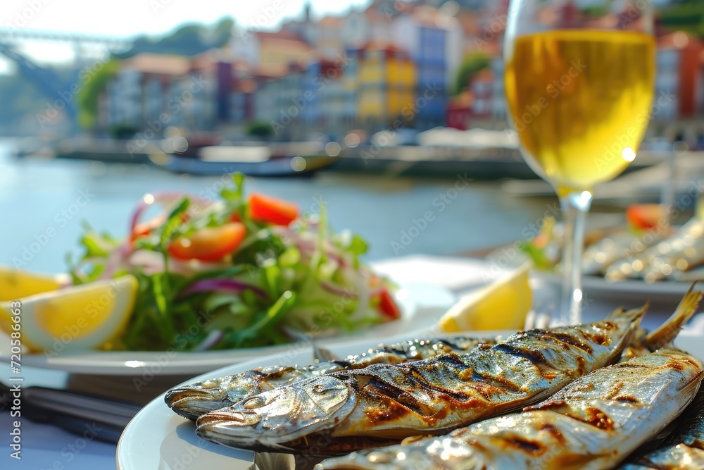 Fototapeta Sardinhas assadas na brasa com pimentos, salada, azeite, pão
