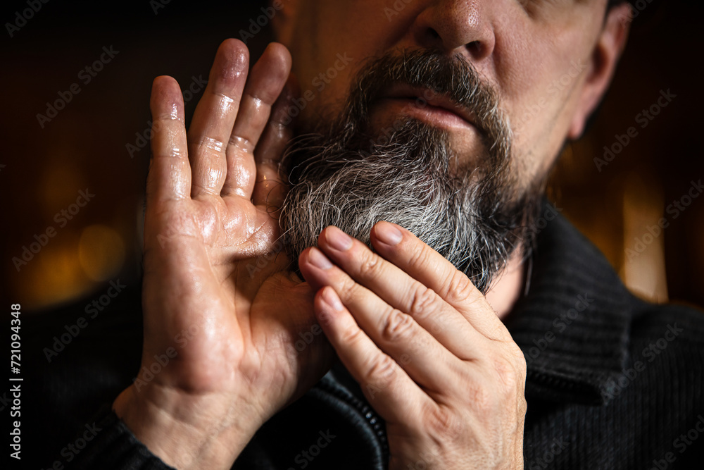 Fototapeta Grey bearded man applying beard oil or serum, care treatment at morning routine
