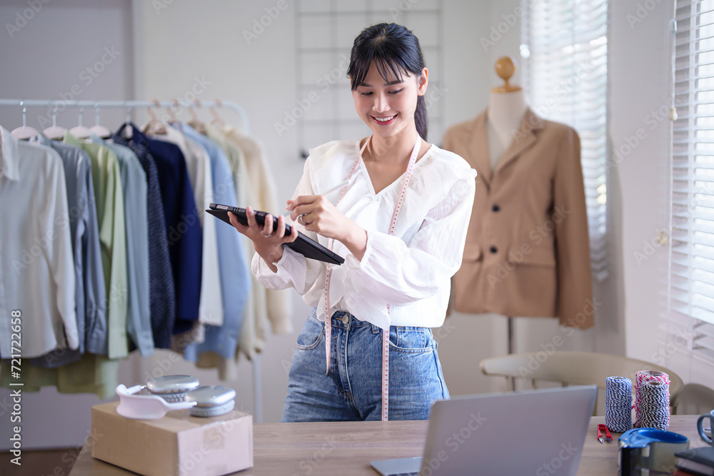 Fototapeta Young asian merchant women wearing measure tape in her neck and writing client i