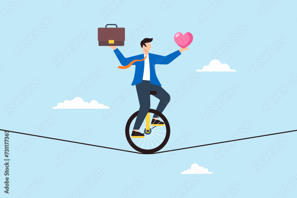 Fototapeta Businessman with unicycle balancing heart and briefcase