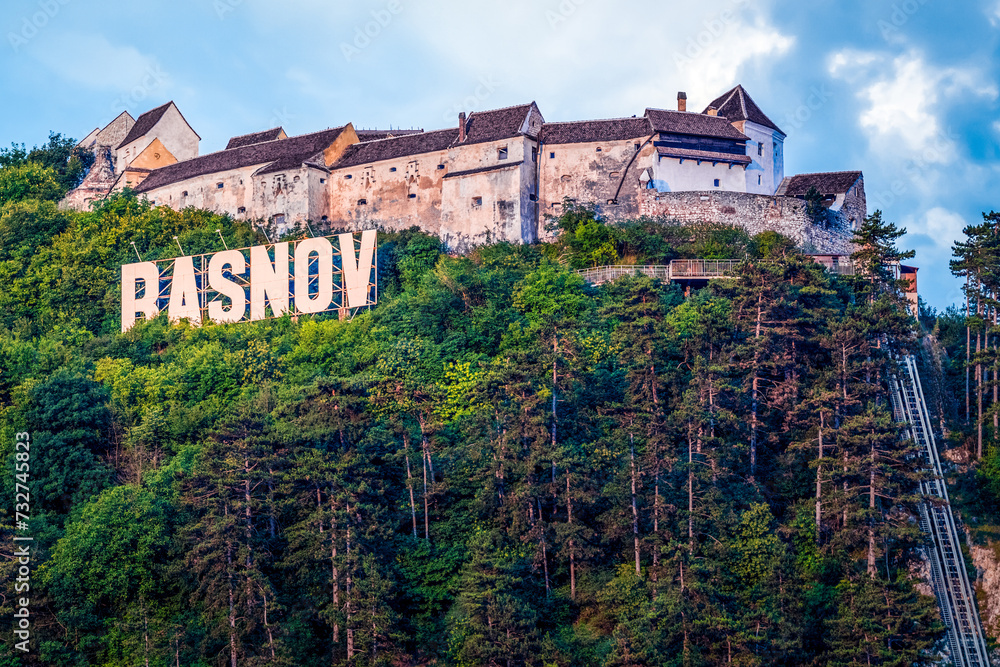 Fototapeta Rasnov citadel and city sign view on the hill, Romania
