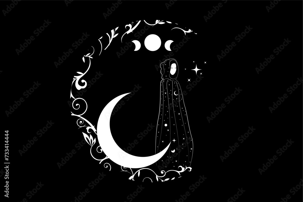 Fototapeta Witch in a black cape, Mystical priestess in a magical cloak with head hood on the white crescent moon
