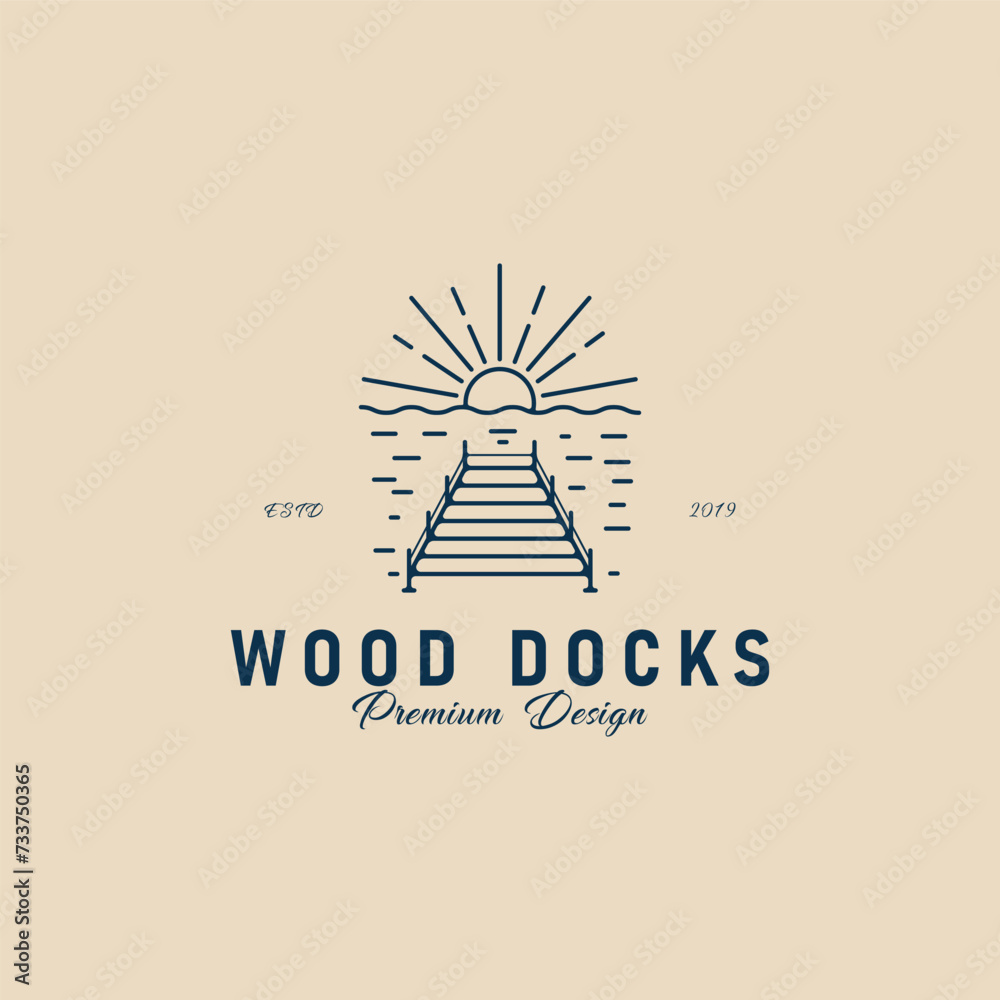 Fototapeta wood docks line art logo, pier logo simple with sunset vector icon illustration