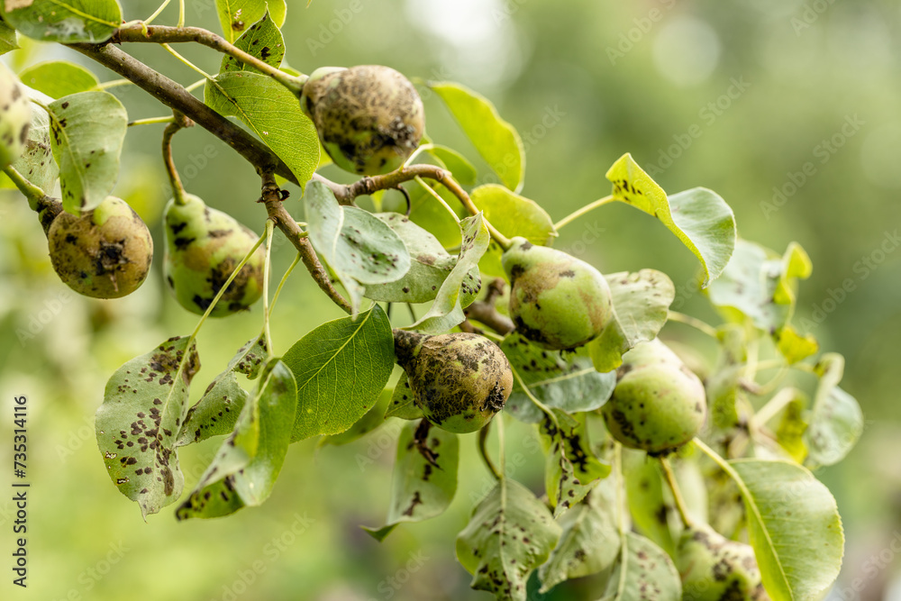 Fototapeta Pear fruits affected by apple scab Venturia inaequalis