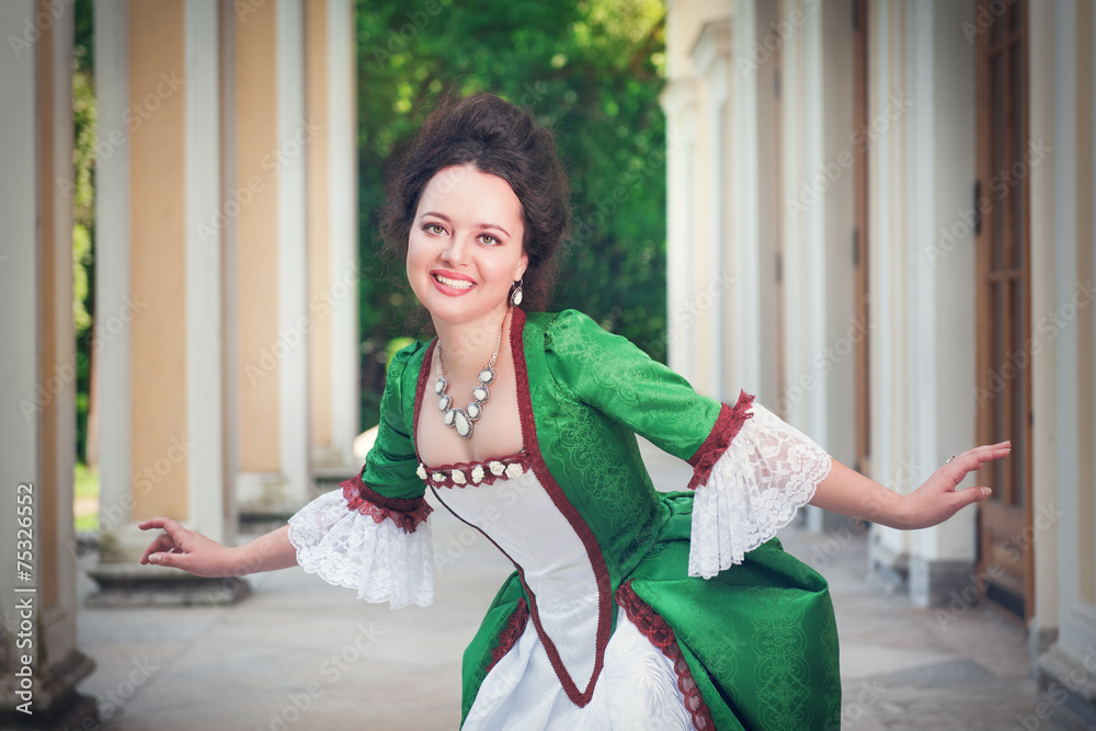 Fototapeta Beautiful woman in green medieval dress doing curtsey