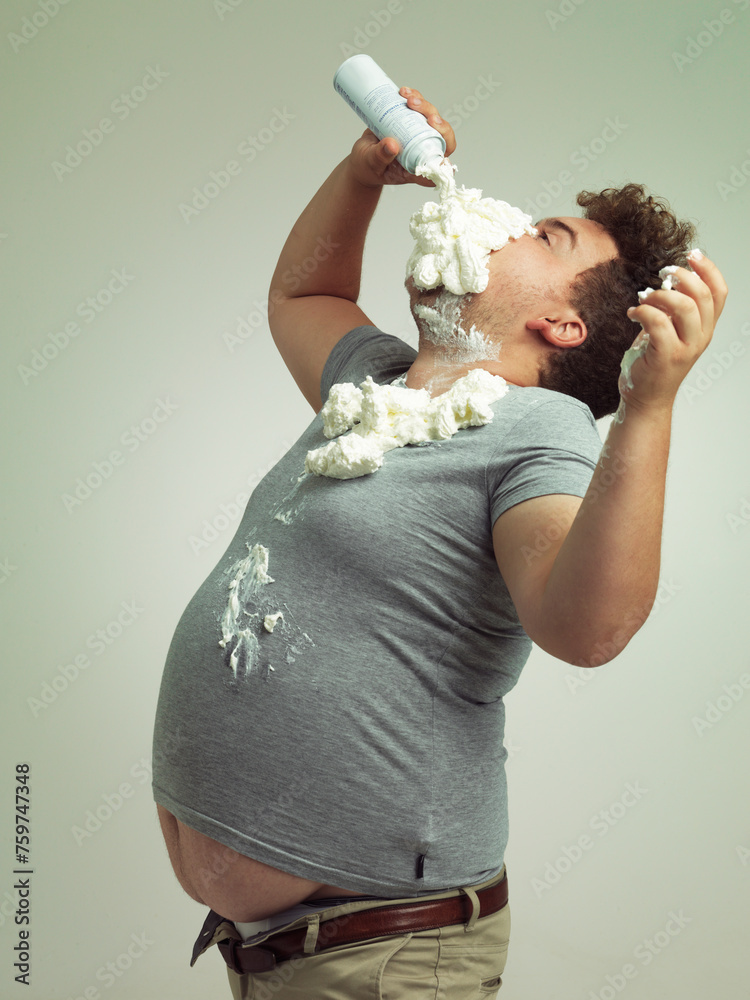 Fototapeta Plus size, eating and man with cream in studio for unhealthy, sugar and sweet snack or dessert