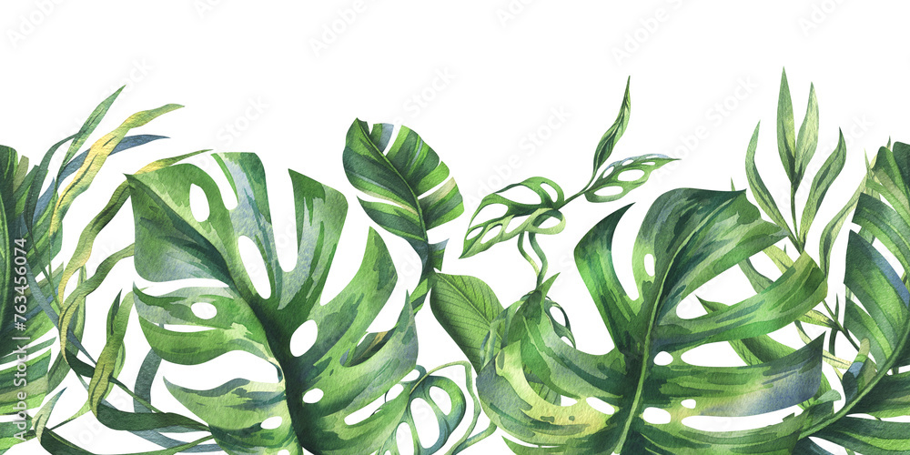 Fototapeta Tropical coconut, banana palm leaves, monstera, monkey mask, frangipani, bright juicy green