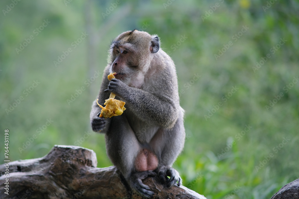 Fototapeta Grey long tailed monkey eating fried banana stolen from homes near the forest