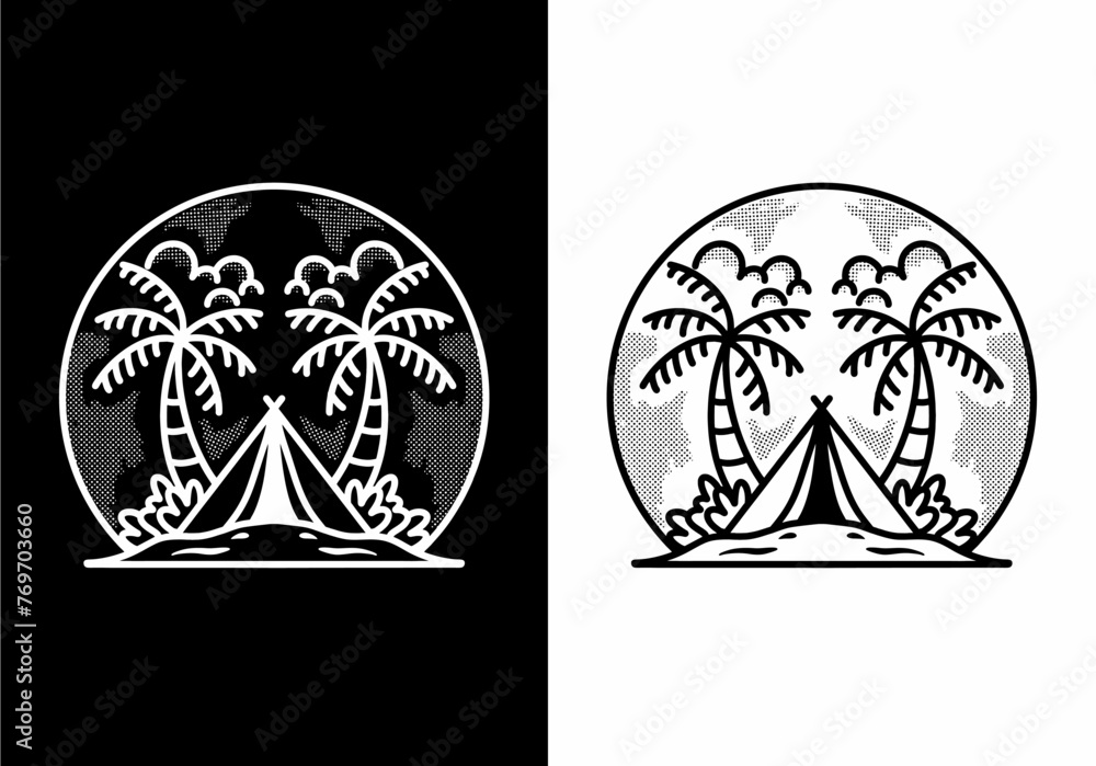 Fototapeta A vector illustration of a logo with palm trees and a camping tent