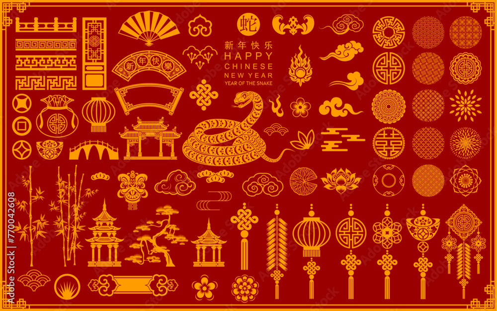 Fototapeta Happy chinese new year 2025 the snake zodiac sign with flower,lantern,asian elements red paper cut style on color background