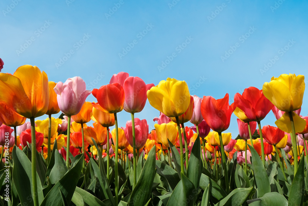 Fototapeta A colourful mix of yellow, red, and pink hybrid triumph tulips in flower