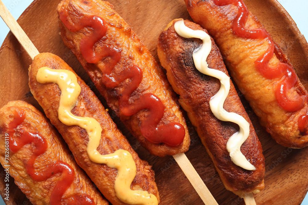 Fototapeta Wooden plate of tasty corn dogs with different sauces on blue background, closeu
