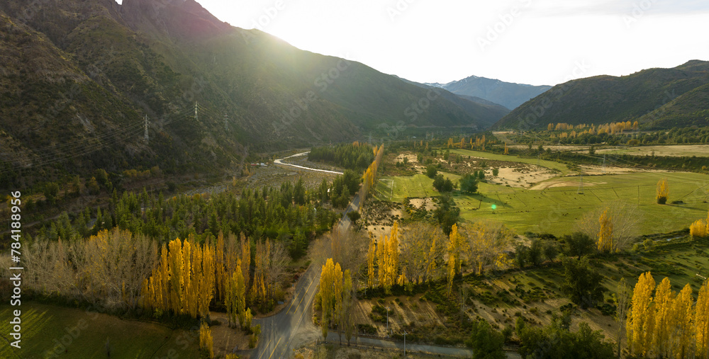 Fototapeta Panoramic view of mountains Andes vallery and road in Chile.