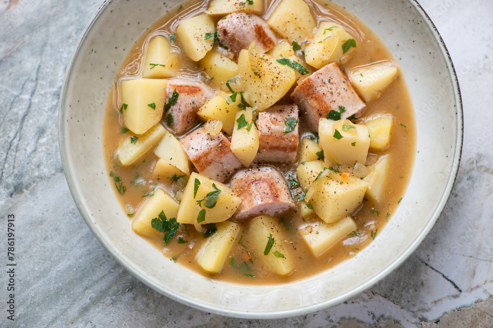 Fototapeta Plate of Dublin coddle or Irish sausage and potato stew, horizontal shot on a gr