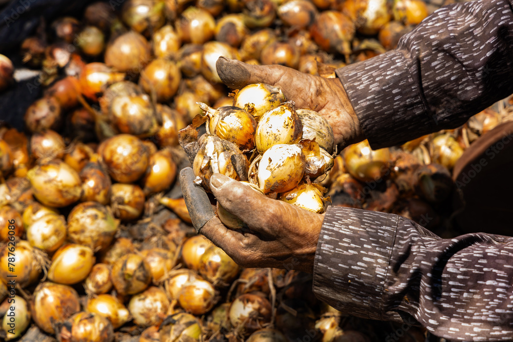 Fototapeta Bulb onion harvest in the agricultural fields of Boyaca, Colombia - Allium cepa