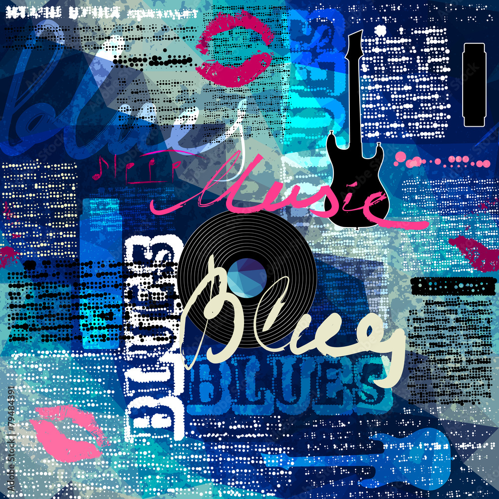 Fototapeta Grunge blue newspaper with original inscriptions Blues and music