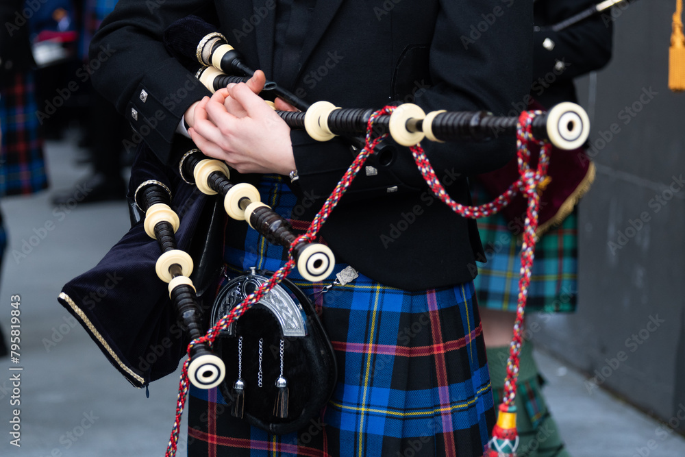 Fototapeta Traditional scottish bagpiper in tartan kilt