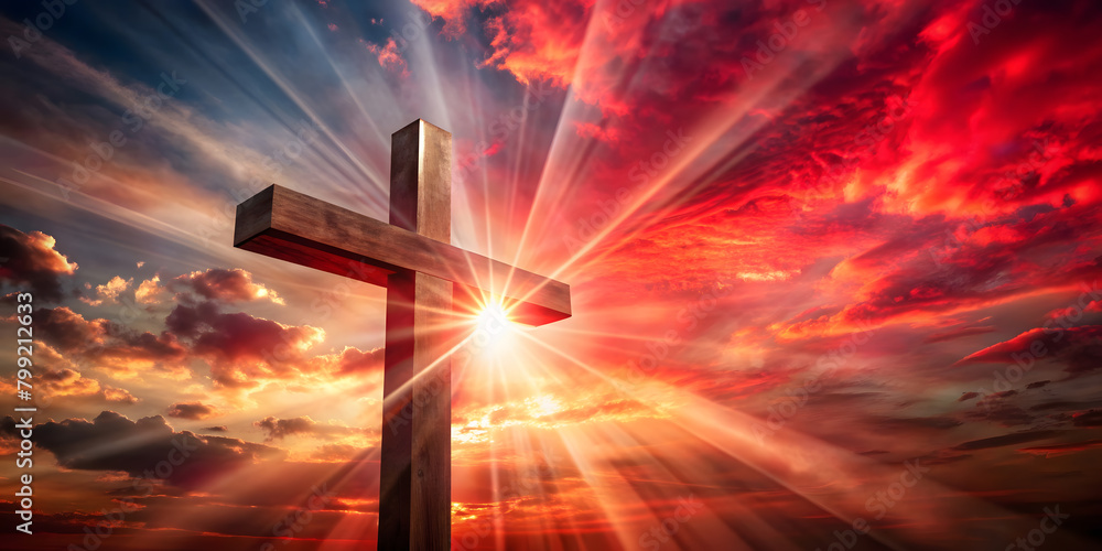 Fototapeta cross on calvary on a background of red light rays, Easter religious background