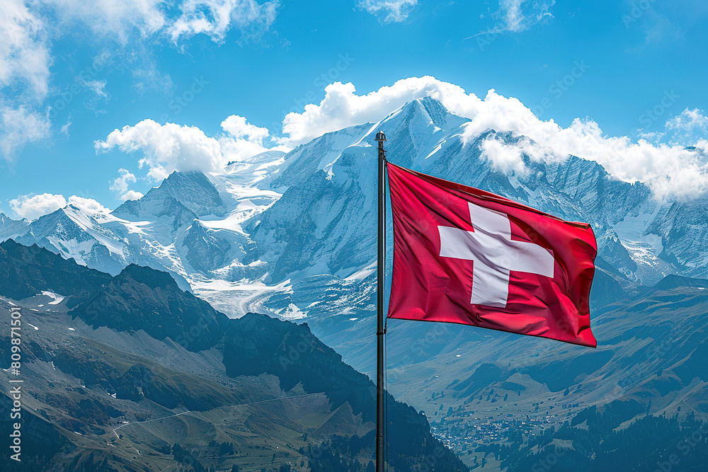 Fototapeta Swiss flag on a background of beautiful mountains on a sunny day