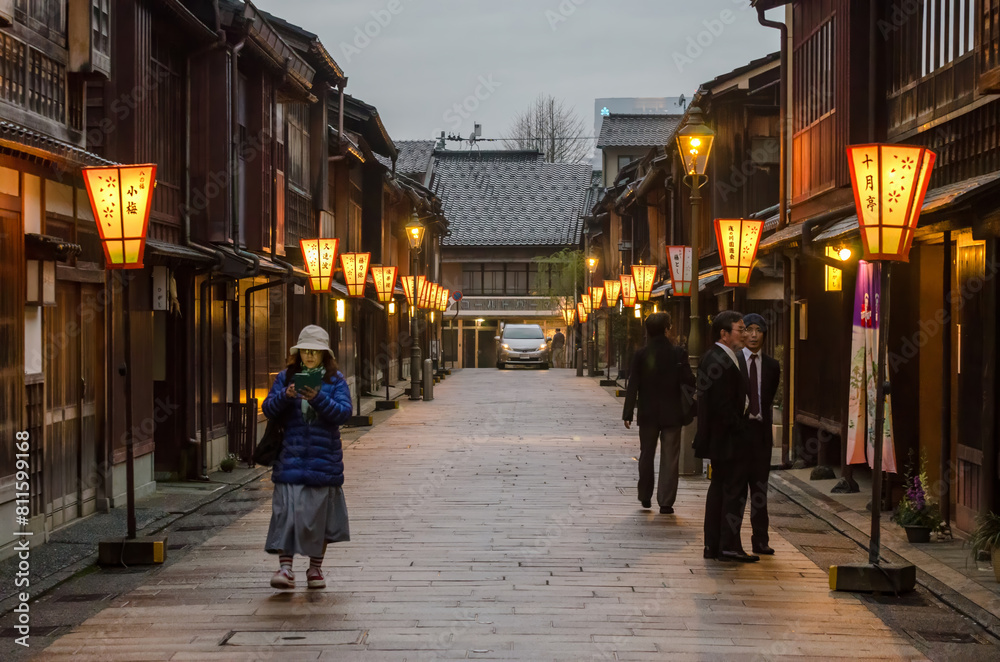 Fototapeta A woman is walking down a narrow street in a japanese town