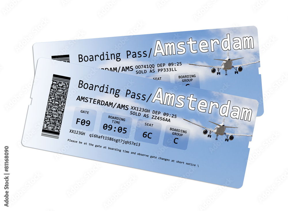 Fototapeta Two airline boarding pass tickets to Amsterdam isolated on white