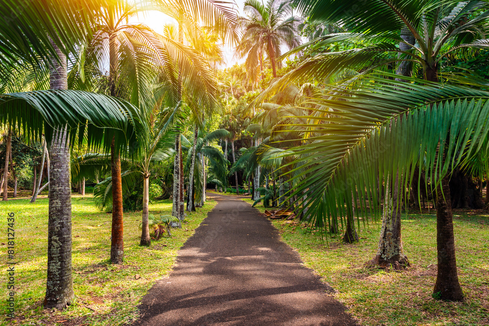 Fototapeta Sir Seewoosagur Ramgoolam Botanical Garden, Pamplemousses, Mauritius island, green avenue along the trees in the Pamplemousses Botanical Garden